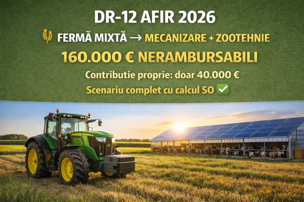📋 SCENARIU REAL DR-12 2026: Acest articol urmărește pas cu pas un tânăr fermier cu fermă mixtă cereale + bovine – de la verificarea eligibilității prin calculul SO, la câștigarea proiectului și investirea celor 160.000 euro nerambursabili (80% din 200.000 euro cheltuieli eligibile) în mecanizare modernă, adăpost zootehnic, irigații și energie fotovoltaică. Un ghid practic, cu cifre reale și linkuri directe la echipamente.