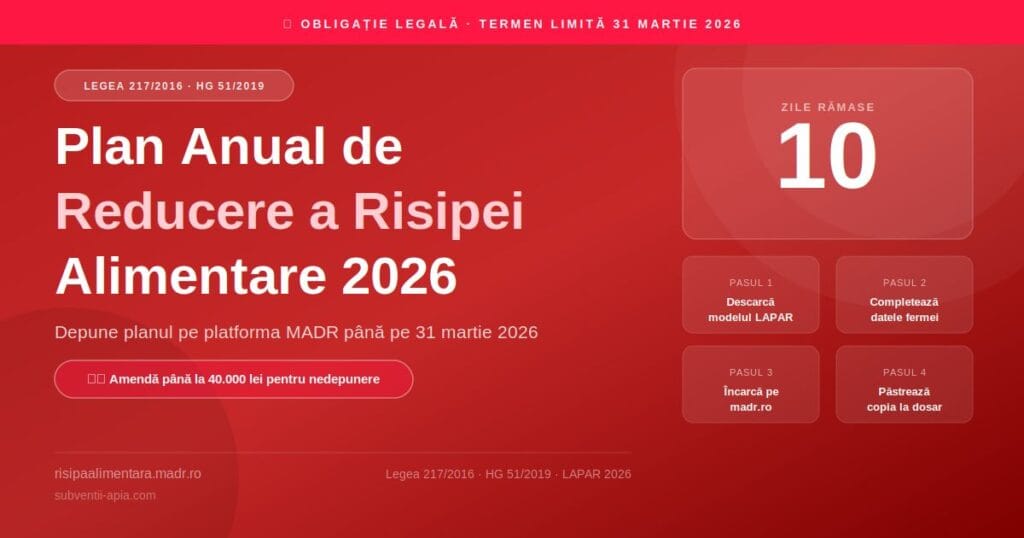➡️ Îndemnăm toți fermierii și producătorii agricoli să acționeze prompt: descărcați modelul pus la dispoziție de LAPAR, completați-l cu datele proprii și depuneți-l în termenul legal, până pe 31 martie 2026, pe platforma MADR la adresa risipaalimentara.madr.ro.